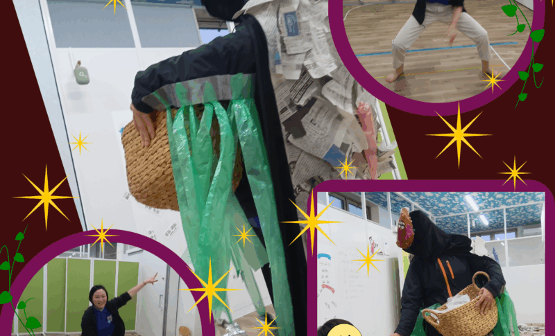 さて、前回、予告いたしました焼いも大会!どうやったら楽しめるか、あーだのこーだの検討に検討を重ねた結果、芋神様が焚火の中から現れることになりました!まずは、自分たちで新聞紙を丸めて作り、『さつまいもの精霊』と綱引きをして引っこ抜いたさつまいもにアルミホイルを巻き、小さいお友だちがちぎってくれた新聞紙の落ち葉の中に入れ、スズランテープの火を着けました。そして焼けるのを待っている間、”ダンサーかおり”の指導の下、『カリスマックス』(みなさんはご存知でしょうが、スノウマンの曲です。スタッフの一部は知らなかった笑)を踊っていました。すると『もののけ姫』の曲と共に焚火の中から芋神様がお出ましになったのです!びっくりしている子どもたちに、芋神様からおいもが配られたのですが、それが本当に食べられたかどうかは企業秘密とさせていただきます。 『さつまいもの精霊』『芋神様』を真剣に扮している先輩を見たキッズで唯一の若者?が「今度は私も!」と張り切っています!次回はぜひ!